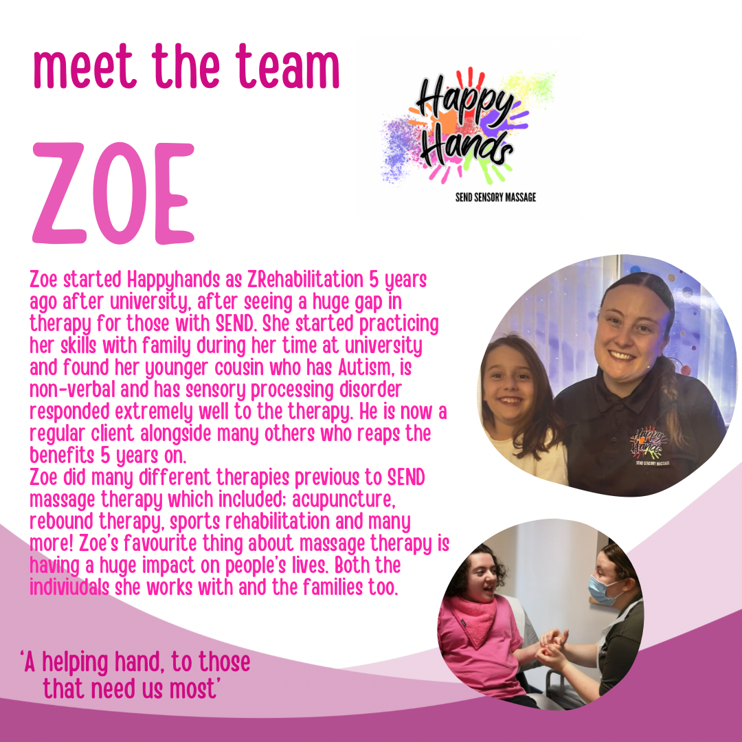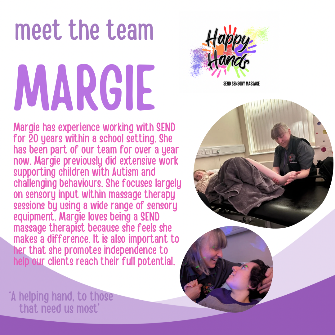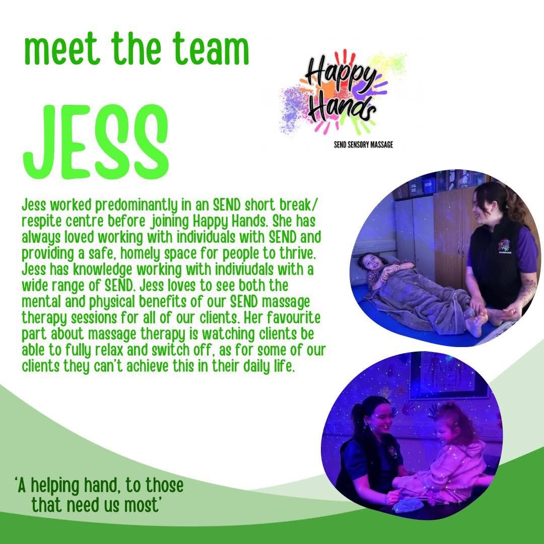 Who we are We are a small team of massage therapists who specialise in SEND massage therapy in the North East. We work with a wide range of individuals during our sessions. Contact UsEmail us: @happyhandssend@gmail.com email us